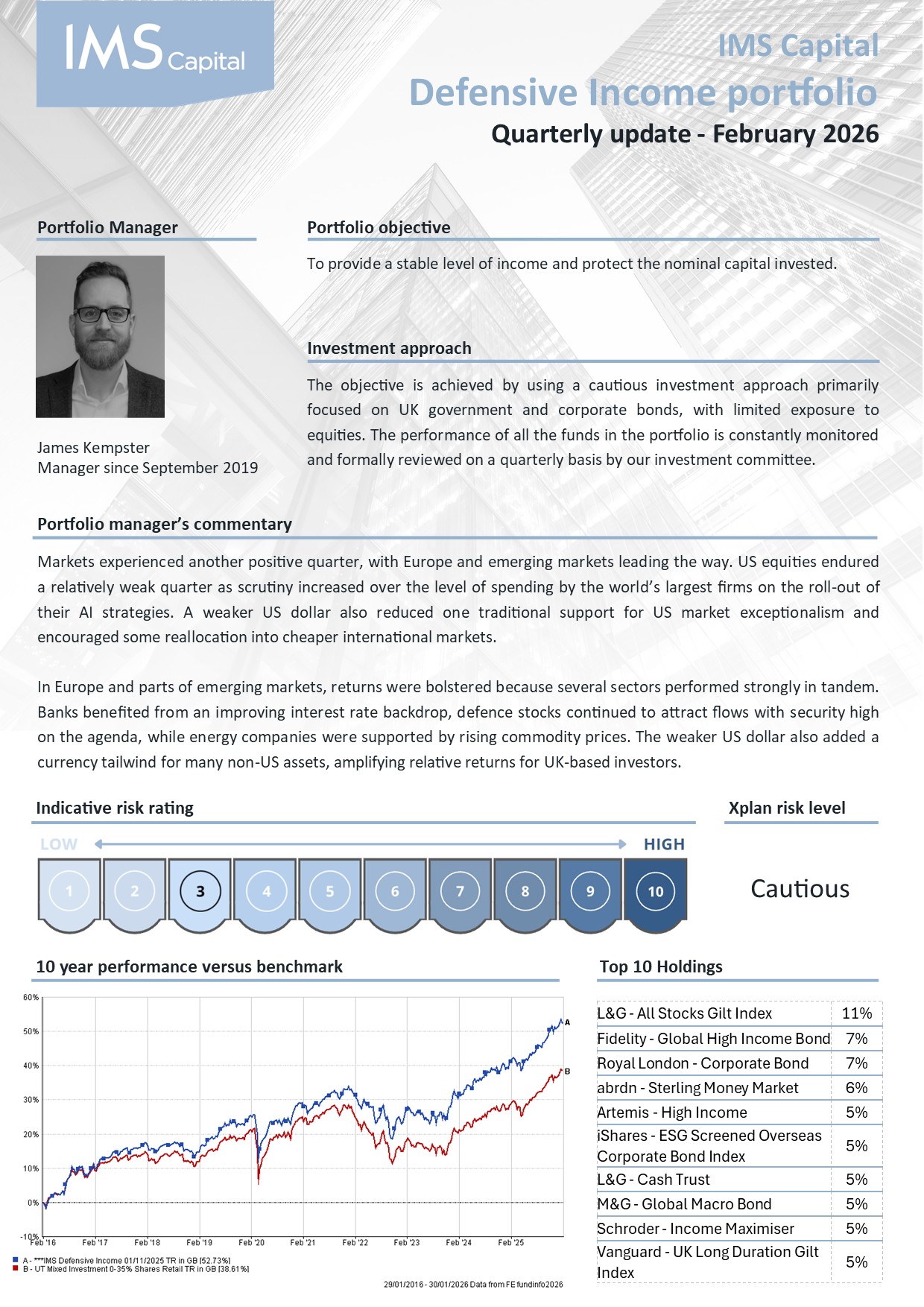 This is achieved by using a cautious investment approach primarily focused on UK government and corporate bonds with limited exposure to equities to provide a degree of inflation-proofing.