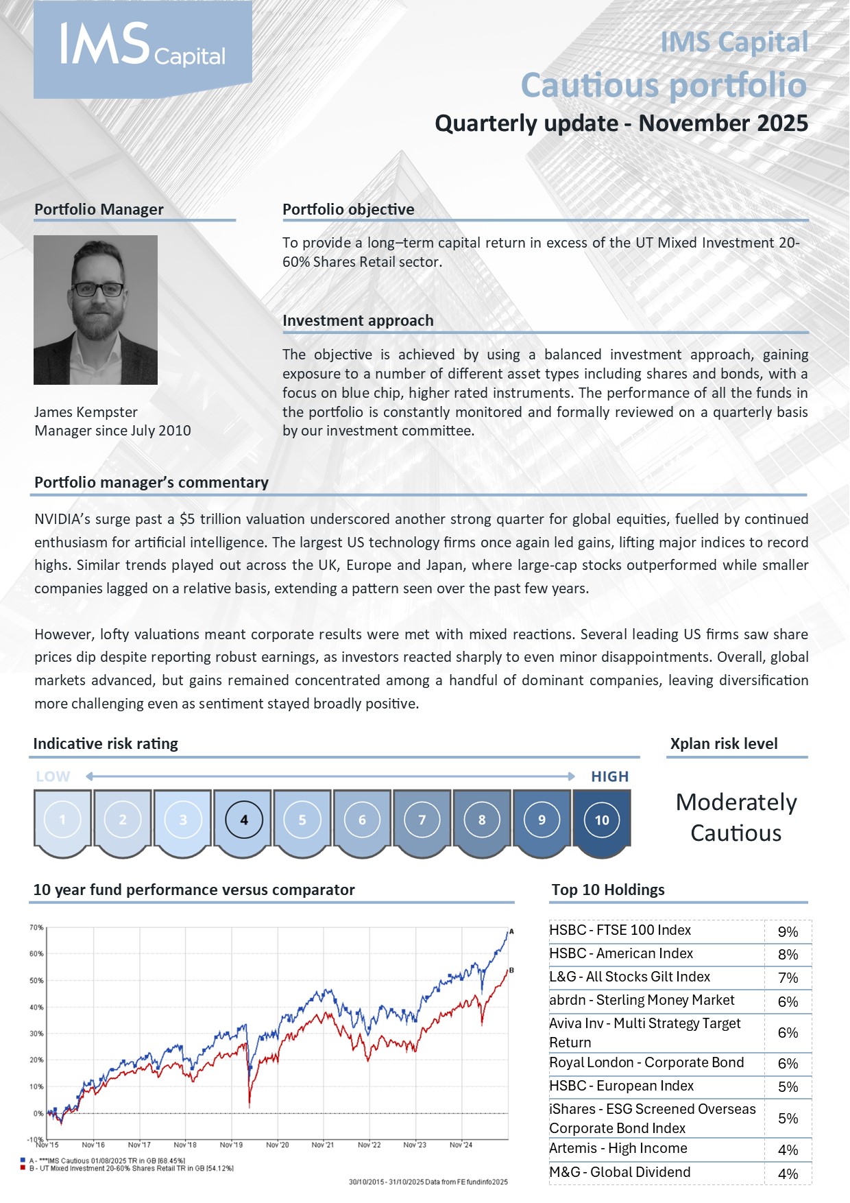 This portfolio is designed to provide a long-term capital return in excess of the IMA 20-60% Equities Retail Sector.