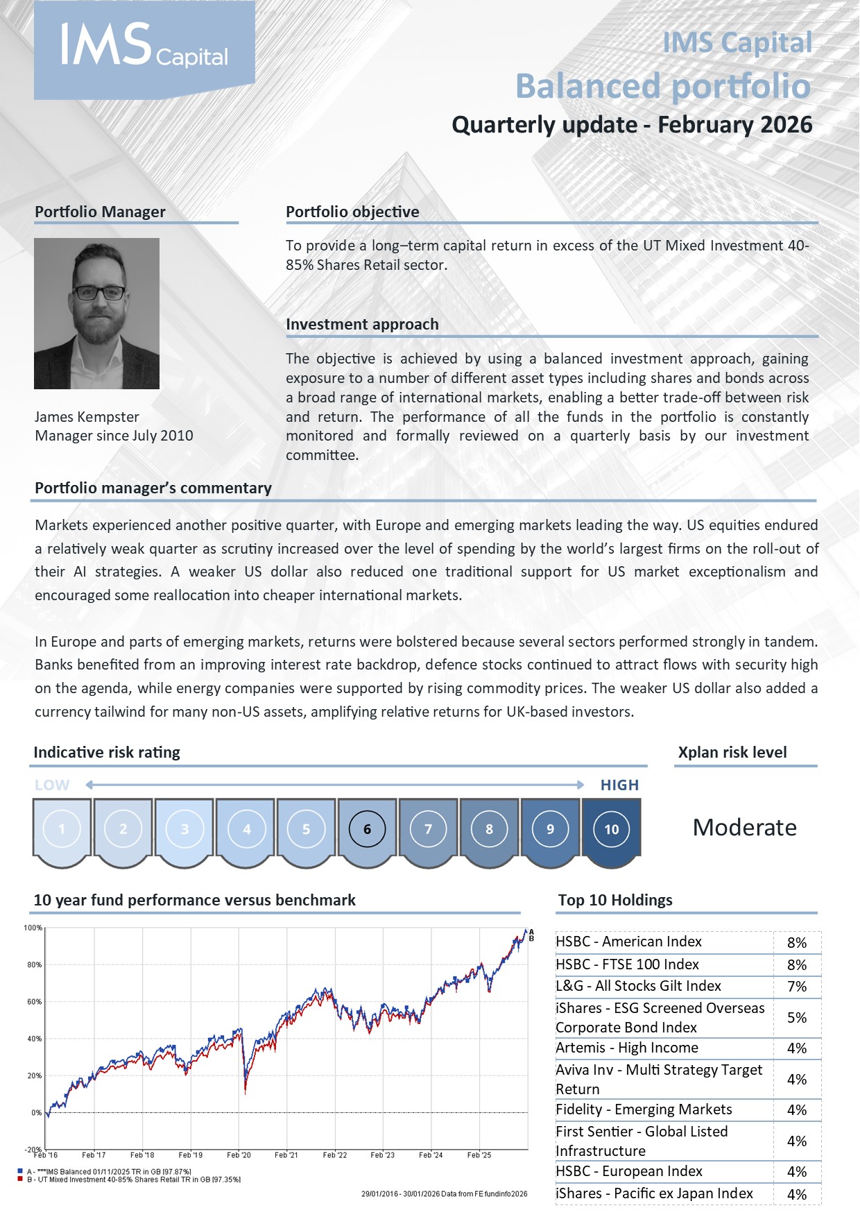 This portfolio was devised to provide a long-term capital return in excess of the IMA 40-85% Equities Retail Sector.