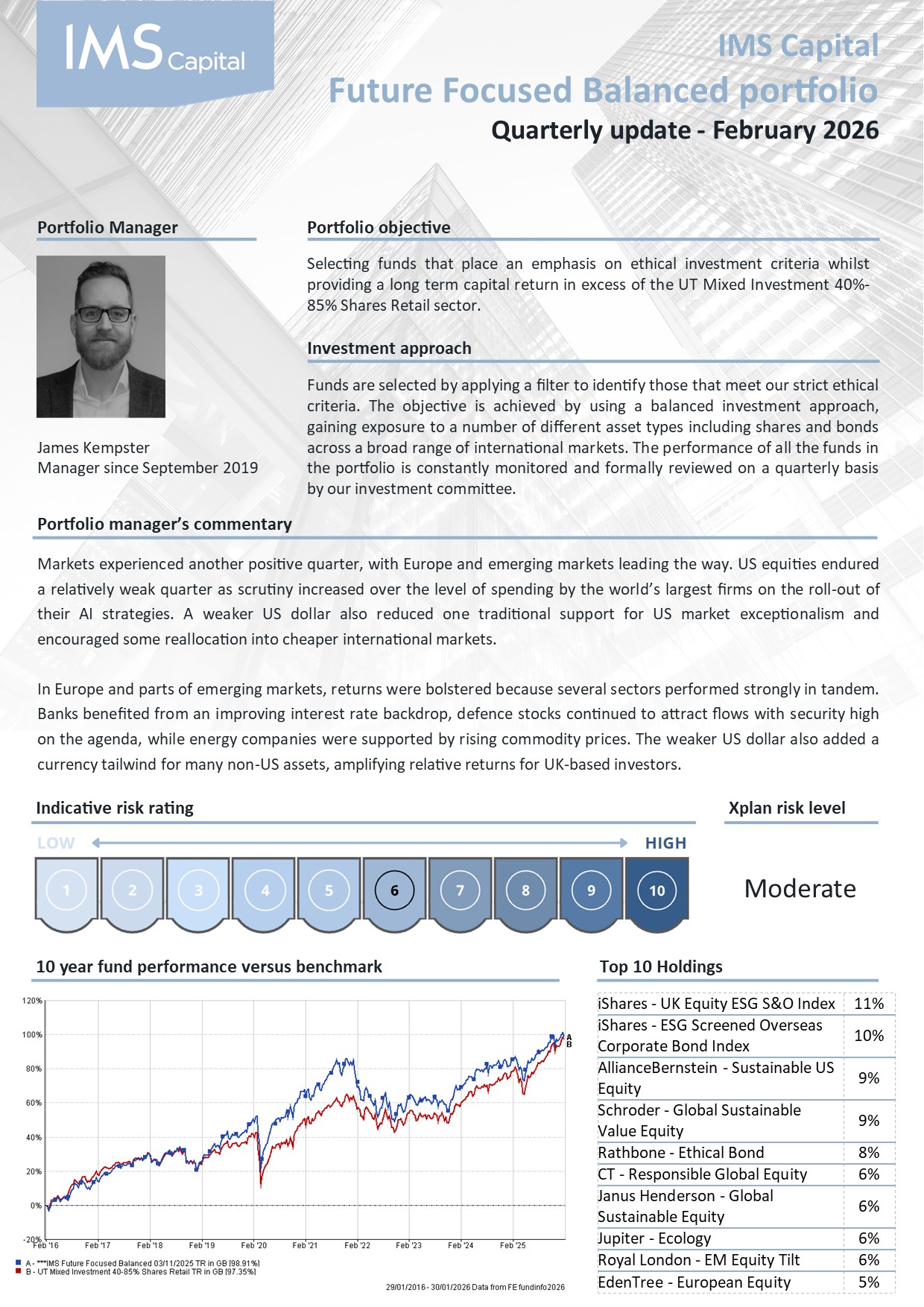 This portfolio is designed to provide a long-term capital return in excess of the IMA 40-85% Equities Retail Sector with an additional objective to invest into funds with a focus on strong social, environmental or governance principles.