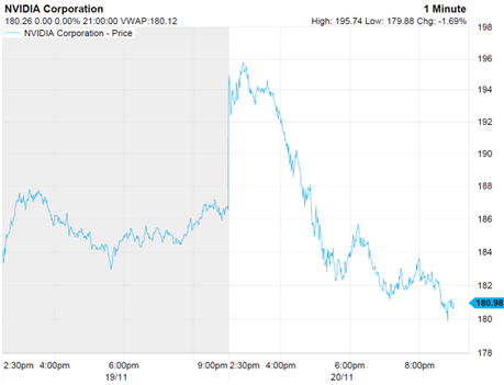 In the event, the company's performance was better than had been forecast, with revenues of $57bn in just the three month period to the end of October. The immediate market reaction was predictably strong. Nvidia’s shares rose more than 5% in advance of the opening of the market, and indices in Asia and Europe also moved higher. However, as the day progressed, sentiment shifted and most of the largest firms finished lower, including an 8% swing for Nvidia that saw them finish in the red.
